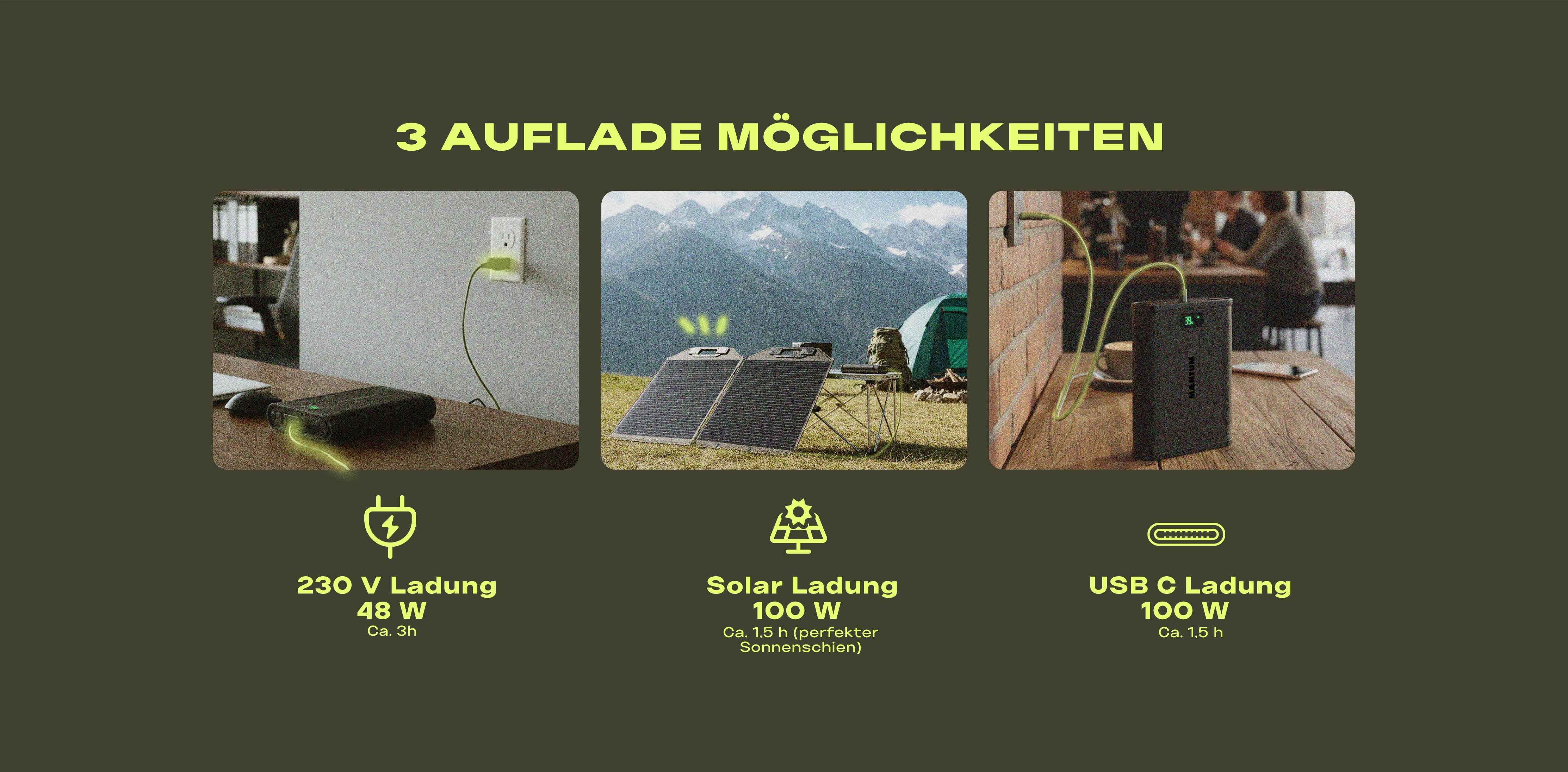 - Mit MPPT 100 W Solar laden (0-100% nur 1,5h)