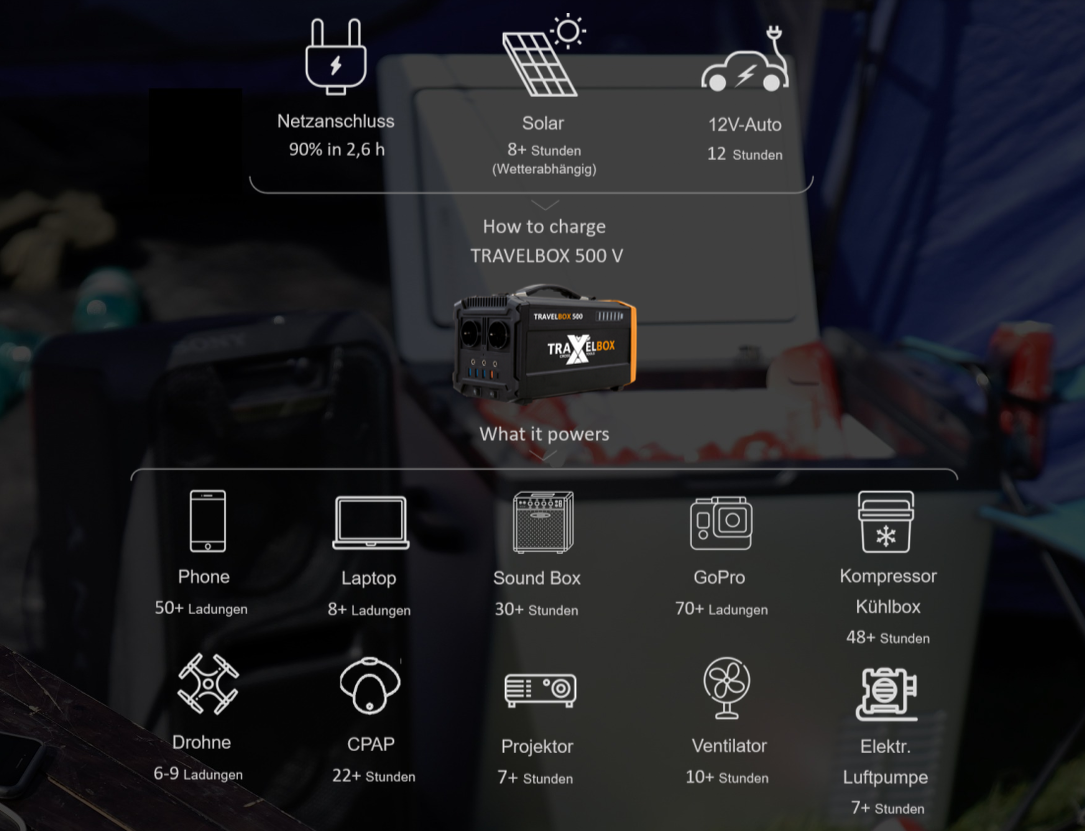 Die Powerstation, die keine Wünsche offen lässt. Die vielfältigen Anschlussmöglichkeiten und ihre hohe Dauerleistung machen die TRAVELBOX zum perfekten Begleiter für Camping, Festivals und auf Reisen.